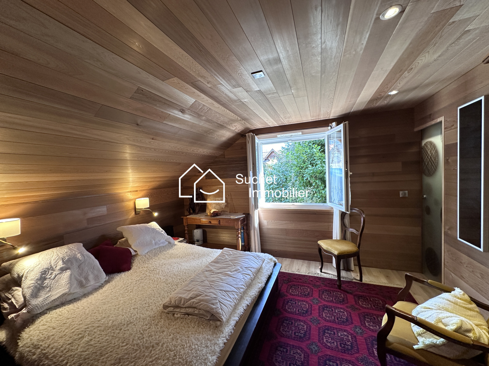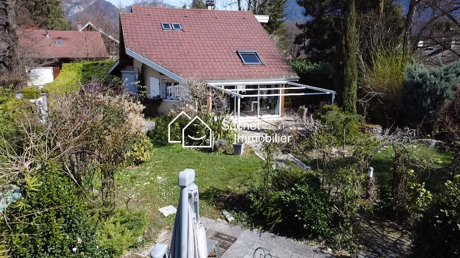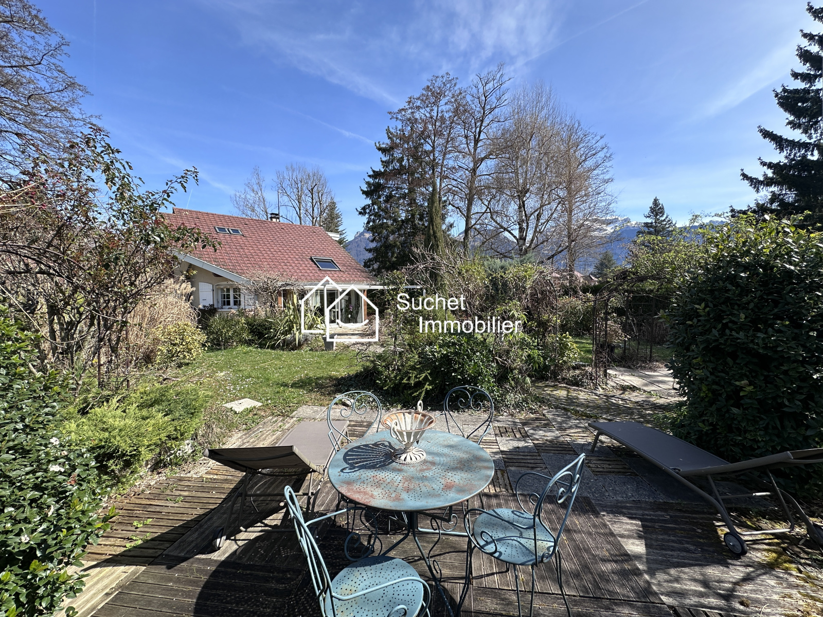 Saint-Jorioz, en retrait de la route du port, maison d'environ 140 m² (126 m² carrez) dans un environnement verdoyant. Vous apprécierez la toute proximité du lac, le calme le jardin entièrement arboré et cloturé ainsi que l'exposition plein sud. Au rez-de-chaussée : Hall d'entrée avec placard, wc indépendant, espace de stockage, suite parentale avec salle-de-bains-wc et dressing. Un espace de vie avec poêle et cuisine équipée semi-ouverte. A l'étage : 1 chambre, deux salles d'eau et une belle mezzanine pouvant facilement être transformée en chambre et un wc indépendant.