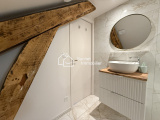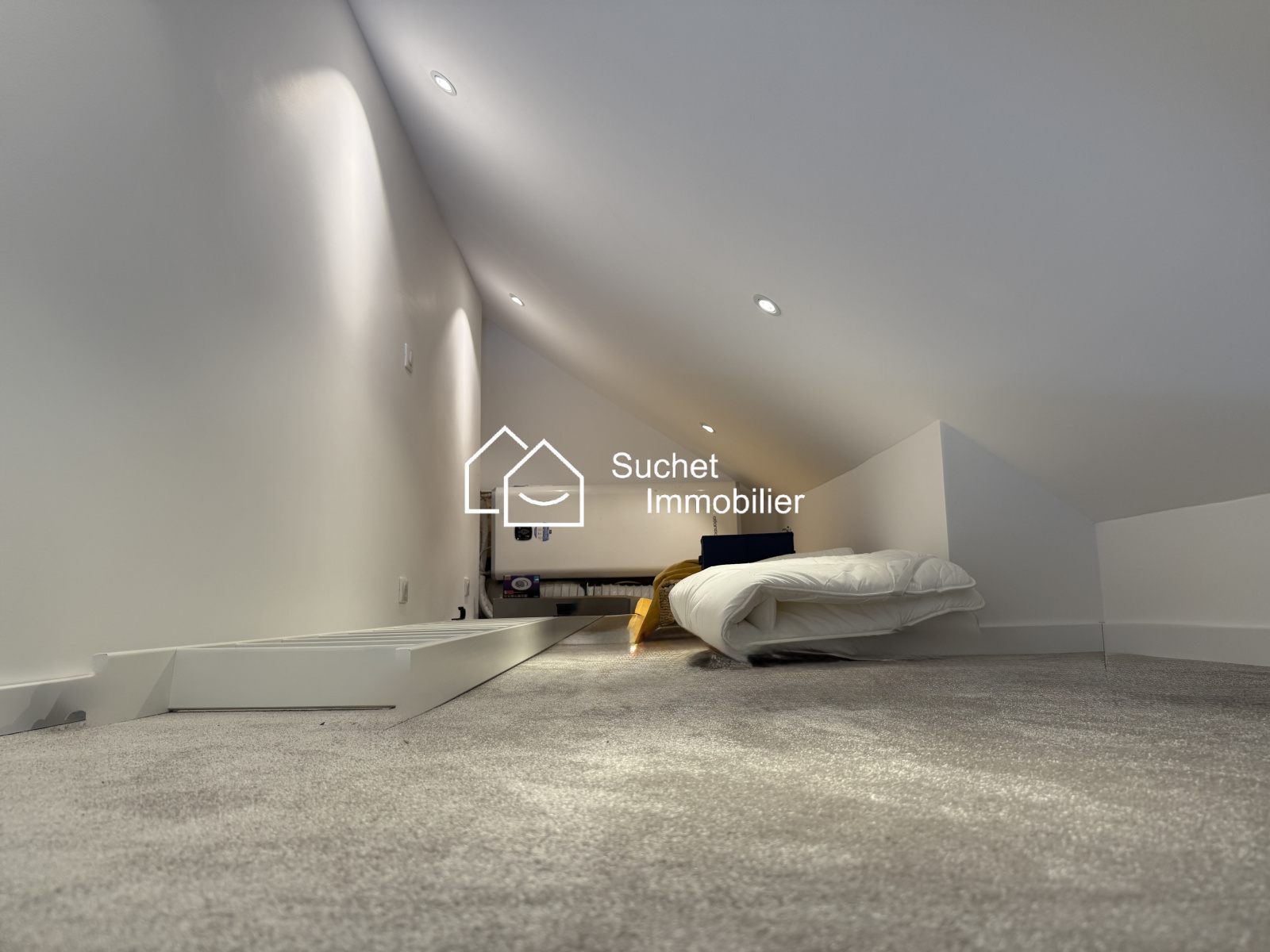 Le séjour cathédrale avec poutres apparentes et cuisine équipée dégage un bel espace de vie lumineux. L’appartement dispose d’une chambre confortable, d’une salle de bains avec WC et branchement pour lave-linge, ainsi que d’une mezzanine (coin nuit d’appoint ou espace lecture) idéale pour optimiser l’espace.